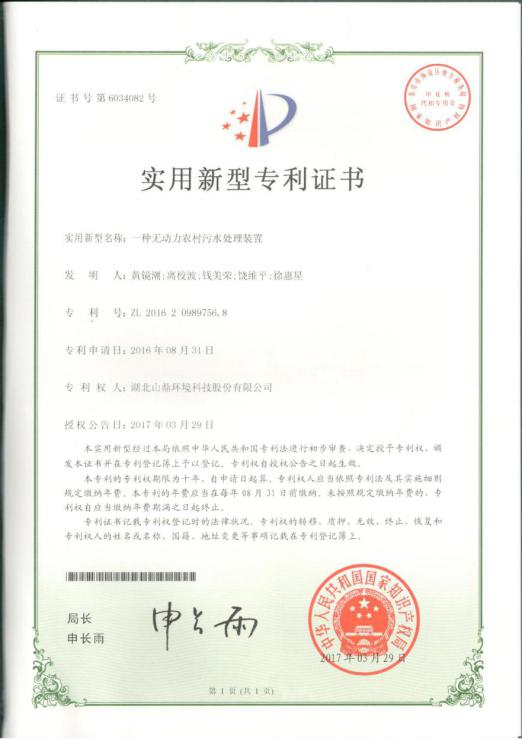 祝贺产学荣获由国家知识产权局授权的“一种无动力农村污水处理装置”实用新型专利证书,专利号为:ZL 2016 2 0989756.8 ;“一种难降解有机物吸附分离系统”实用新型专利证书,专利号为:ZL 2016 2 1002444.x 。